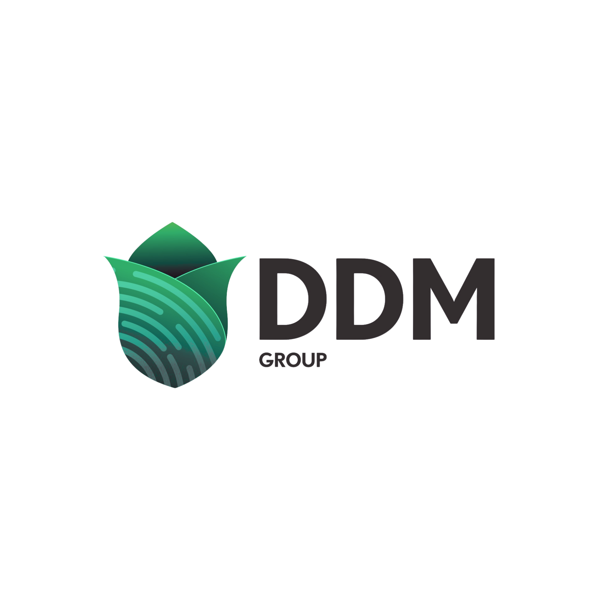 • Group of seven diverse people smiling and posing together in a studio against a plain light gray background.